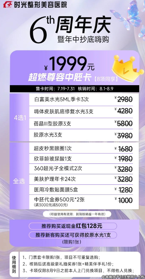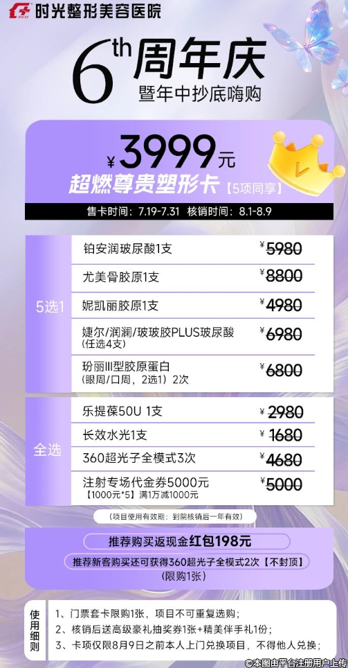 興義時光整形 · 6周年慶暨年中抄底嗨購會,推出超燃尊享體驗卡,9選5只要199元,超燃尊顏抗衰卡,8項同享999元,超燃尊容中胚卡,8項同享1999元,超燃尊貴塑形卡,5項同享3999元,超大優(yōu)惠全場一折起。