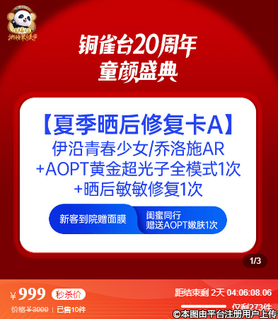重慶新銅雀臺超值20周年慶特惠,夏季曬后修復卡A,999元,讓你輕松不怕太陽曬傷!秀自己身材