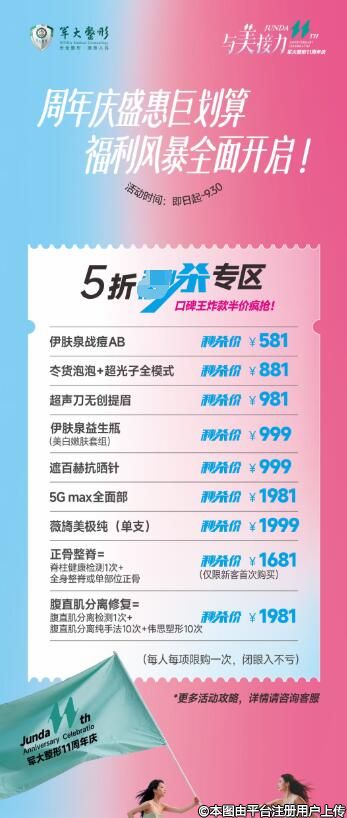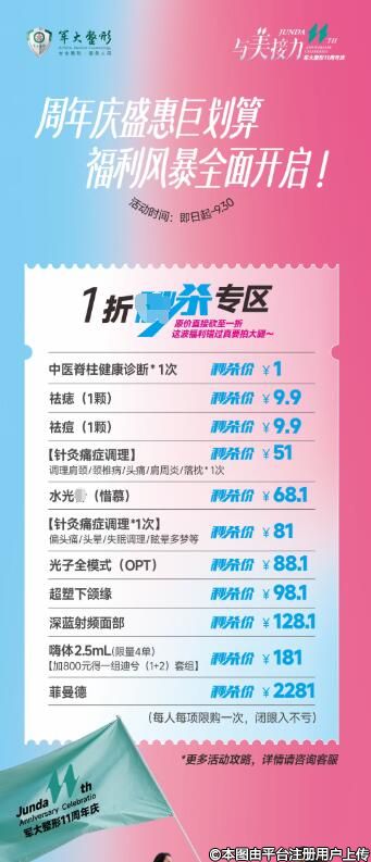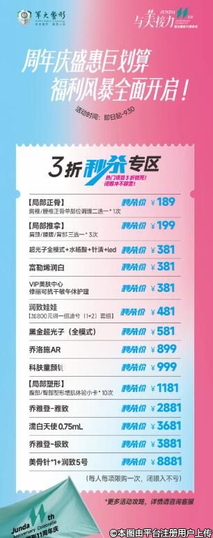 價(jià)格為什么如此美麗?答案就在軍大周年慶!周年慶一折專區(qū),精選項(xiàng)目低至冰點(diǎn)價(jià),祛痘祛痣、光子全模式、超塑下頜緣...只需1元起,美麗蛻變不再是夢(mèng)!限購(gòu)一次,把握機(jī)會(huì),讓美麗觸手可及。