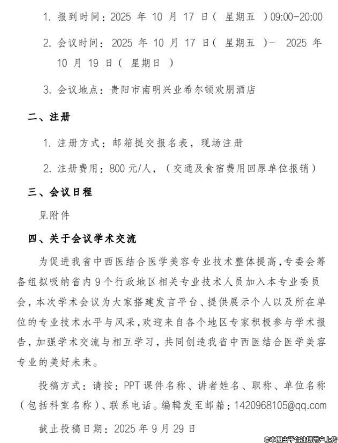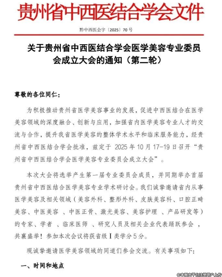 貴州省中西醫(yī)結(jié)合學(xué)會(huì)醫(yī)學(xué)美容專業(yè)委員會(huì)成立大會(huì)擬于2025年10月17-19日在貴陽召開