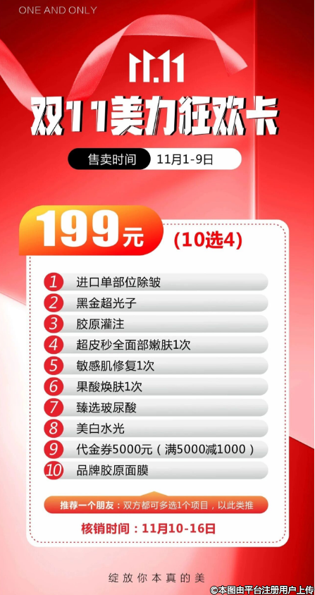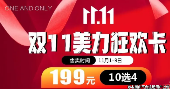壹加壹雙11美力狂歡卡超燃來(lái)襲,熱門(mén)10大爆款任選4項(xiàng)!超級(jí)劃算。雙11美力狂歡卡 預(yù)售來(lái)襲!熱門(mén)10大爆款限時(shí)秒殺!僅需199元任選4項(xiàng)!
