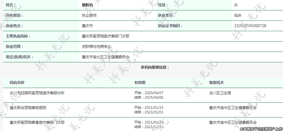 主要執(zhí)業(yè)機(jī)構(gòu):重慶鄭荃麗格醫(yī)療美容門診部