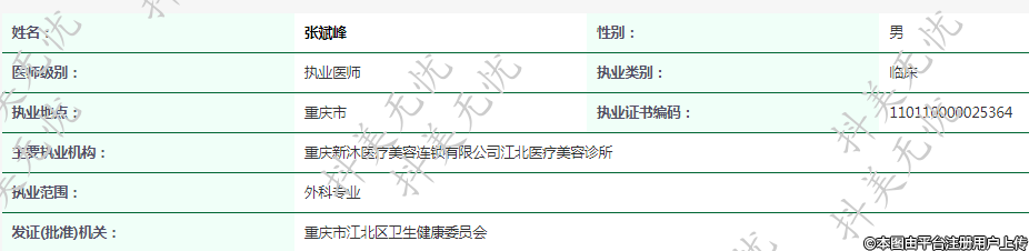 主要執(zhí)業(yè)機構(gòu):重慶新沐醫(yī)療美容連鎖有限公司江北醫(yī)療美容診所