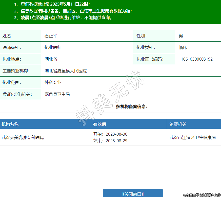 姓名:石正平性別:男醫(yī)師級(jí)別:執(zhí)業(yè)醫(yī)師執(zhí)業(yè)類別:臨床執(zhí)業(yè)地點(diǎn):湖北省執(zhí)業(yè)證書編碼:110610300003192主要執(zhí)業(yè)機(jī)構(gòu):湖北省嘉魚縣人民醫(yī)院執(zhí)業(yè)范圍:外科專業(yè)發(fā)證(批準(zhǔn))機(jī)關(guān):嘉魚縣衛(wèi)生局多機(jī)構(gòu)備案信息:機(jī)構(gòu)名稱 有效期 備案機(jī)關(guān) 武漢天美乳腺??漆t(yī)院 開始:2023-08-30結(jié)束:2025-08-29武漢市江漢區(qū)衛(wèi)生健康局 -