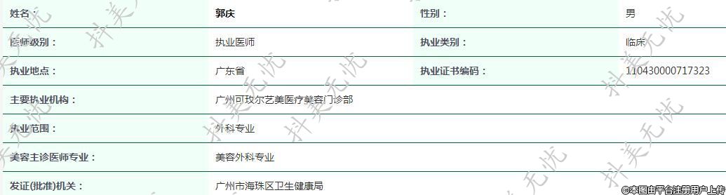 姓名:郭慶性別:男醫(yī)師級(jí)別:執(zhí)業(yè)醫(yī)師執(zhí)業(yè)類別:臨床執(zhí)業(yè)地點(diǎn):廣東省執(zhí)業(yè)證書編碼:110430000717323主要執(zhí)業(yè)機(jī)構(gòu):廣州可玫爾藝美醫(yī)療美容門診部執(zhí)業(yè)范圍:口外科專業(yè)美容主診醫(yī)師專業(yè):美容皮膚科專業(yè)發(fā)證(批準(zhǔn))機(jī)關(guān):廣州市海珠區(qū)衛(wèi)生健康局文章內(nèi)容來(lái)源:國(guó)家衛(wèi)生健康委員會(huì) -