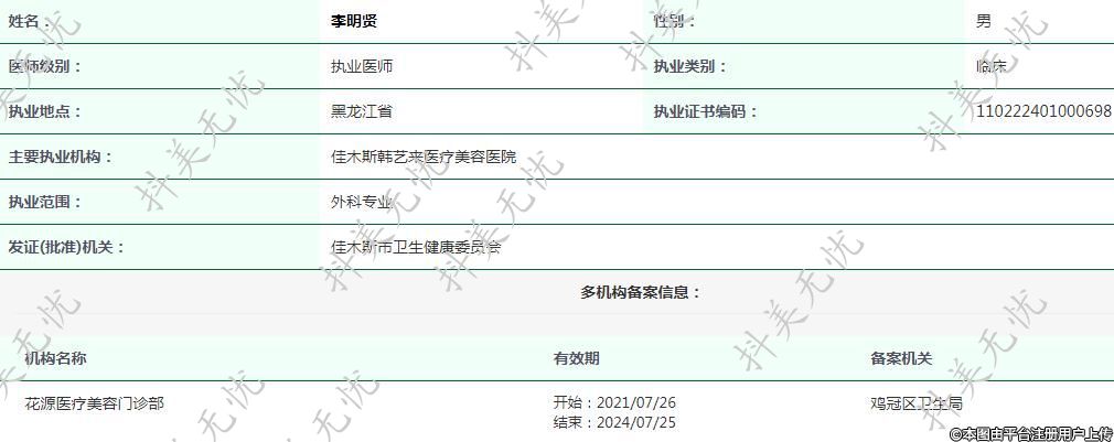 現(xiàn)任佳木斯韓藝來醫(yī)療美容醫(yī)院執(zhí)業(yè)醫(yī)師