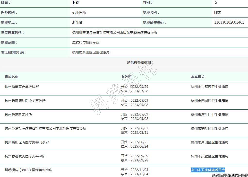 主要執(zhí)業(yè)機(jī)構(gòu):杭州班睿漫詩醫(yī)院管理有限公司蕭山振寧路醫(yī)療美容診所