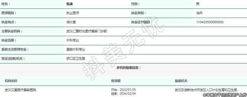 主要執(zhí)業(yè)機(jī)構(gòu):武漢仁愛時光醫(yī)療美容門診部