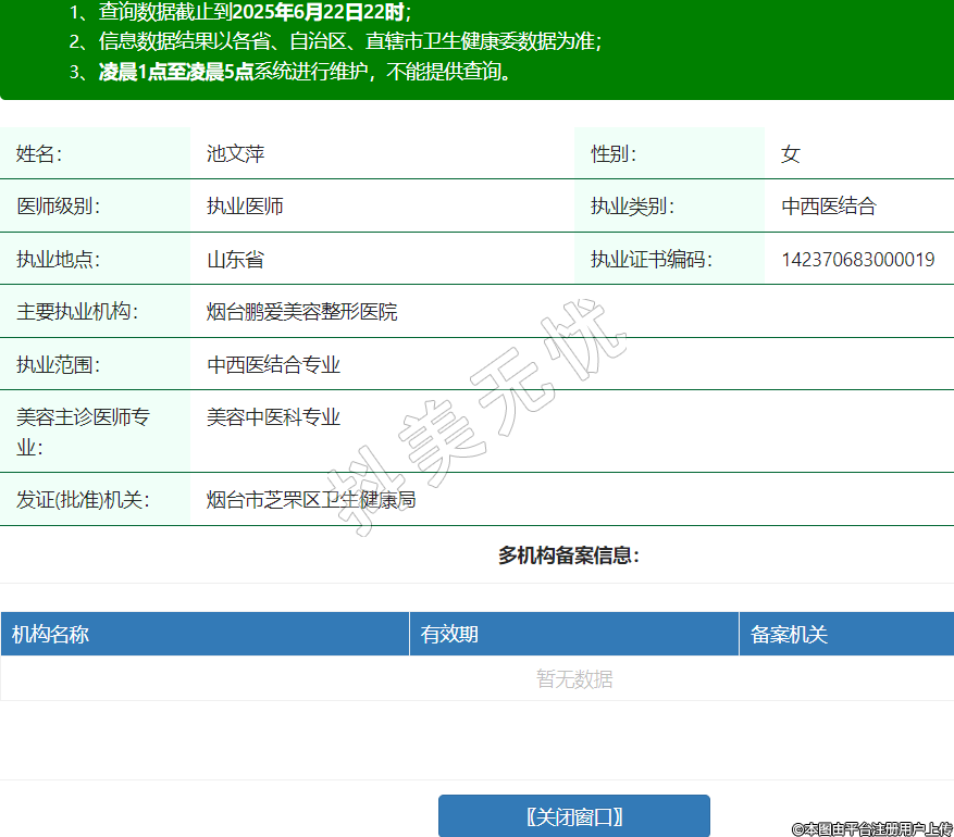 姓名:池文萍性別:女醫(yī)師級別:執(zhí)業(yè)醫(yī)師執(zhí)業(yè)類別:中西醫(yī)結(jié)合執(zhí)業(yè)地點:山東省執(zhí)業(yè)證書編碼:142370683000019主要執(zhí)業(yè)機構(gòu):煙臺鵬愛美容整形醫(yī)院執(zhí)業(yè)范圍:中西醫(yī)結(jié)合專業(yè)美容主診醫(yī)師專業(yè):美容中醫(yī)科專業(yè)發(fā)證(批準)機關(guān):煙臺市芝罘區(qū)衛(wèi)生健康局 -