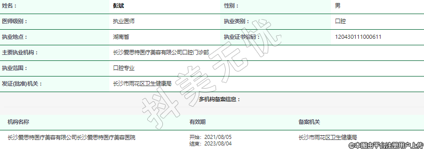 主要執(zhí)業(yè)機(jī)構(gòu):長沙愛思特醫(yī)療美容有限公司口腔門診部