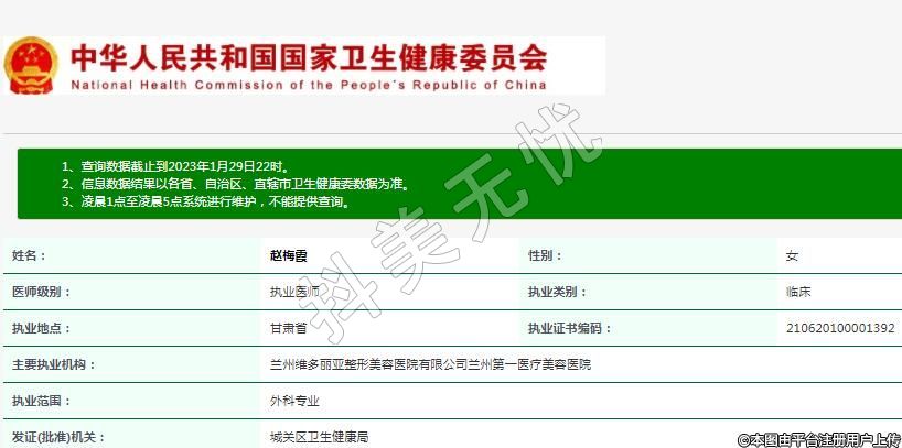 主要執(zhí)業(yè)機構(gòu):蘭州維多麗亞整形美容醫(yī)院有限公司蘭州第一醫(yī)療美容醫(yī)院