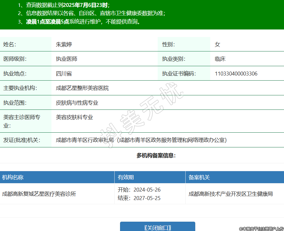 姓名:朱紫婷性別:女醫(yī)師級別:執(zhí)業(yè)醫(yī)師執(zhí)業(yè)類別:臨床執(zhí)業(yè)地點:四川省執(zhí)業(yè)證書編碼:110330400003306主要執(zhí)業(yè)機構(gòu):成都藝星整形美容醫(yī)院執(zhí)業(yè)范圍:皮膚病與性病專業(yè)美容主診醫(yī)師專業(yè):美容皮膚科專業(yè)發(fā)證(批準(zhǔn))機關(guān):成都市青羊區(qū)行政審批局(成都市青羊區(qū)政務(wù)服務(wù)管理和網(wǎng)絡(luò)理政辦公室)多機構(gòu)備案信息:機構(gòu)名稱 有效期 備案機關(guān) 成都高新復(fù)城藝星醫(yī)療美容診所 開始:2024-05-26結(jié)束:2027-05-25成都高新技術(shù)產(chǎn)業(yè)開發(fā)區(qū)衛(wèi)生健康局 -