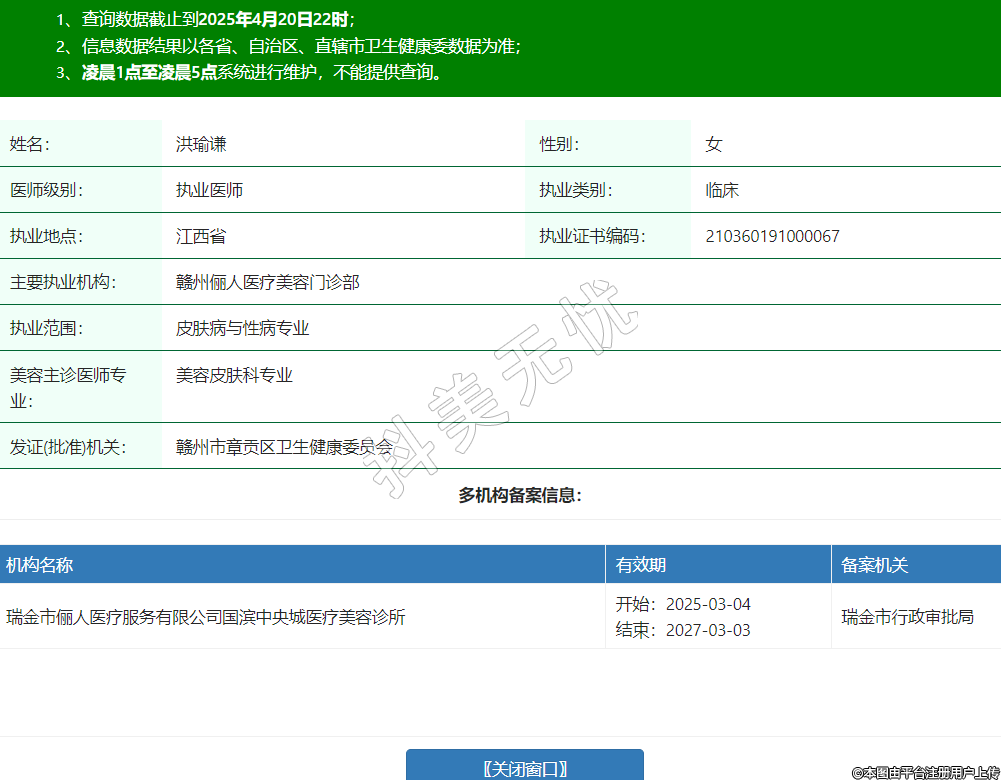 姓名:洪瑜謙性別:女醫(yī)師級(jí)別:執(zhí)業(yè)醫(yī)師執(zhí)業(yè)類別:臨床執(zhí)業(yè)地點(diǎn):江西省執(zhí)業(yè)證書編碼:210360191000067主要執(zhí)業(yè)機(jī)構(gòu):贛州儷人醫(yī)療美容門診部執(zhí)業(yè)范圍:皮膚病與性病專業(yè)美容主診醫(yī)師專業(yè):美容皮膚科專業(yè)發(fā)證(批準(zhǔn))機(jī)關(guān):贛州市章貢區(qū)衛(wèi)生健康委員會(huì)多機(jī)構(gòu)備案信息:機(jī)構(gòu)名稱 有效期 備案機(jī)關(guān) 瑞金市儷人醫(yī)療服務(wù)有限公司國(guó)濱中央城醫(yī)療美容診所 開始:2025-03-04結(jié)束:2027-03-03瑞金市行政審批局 -