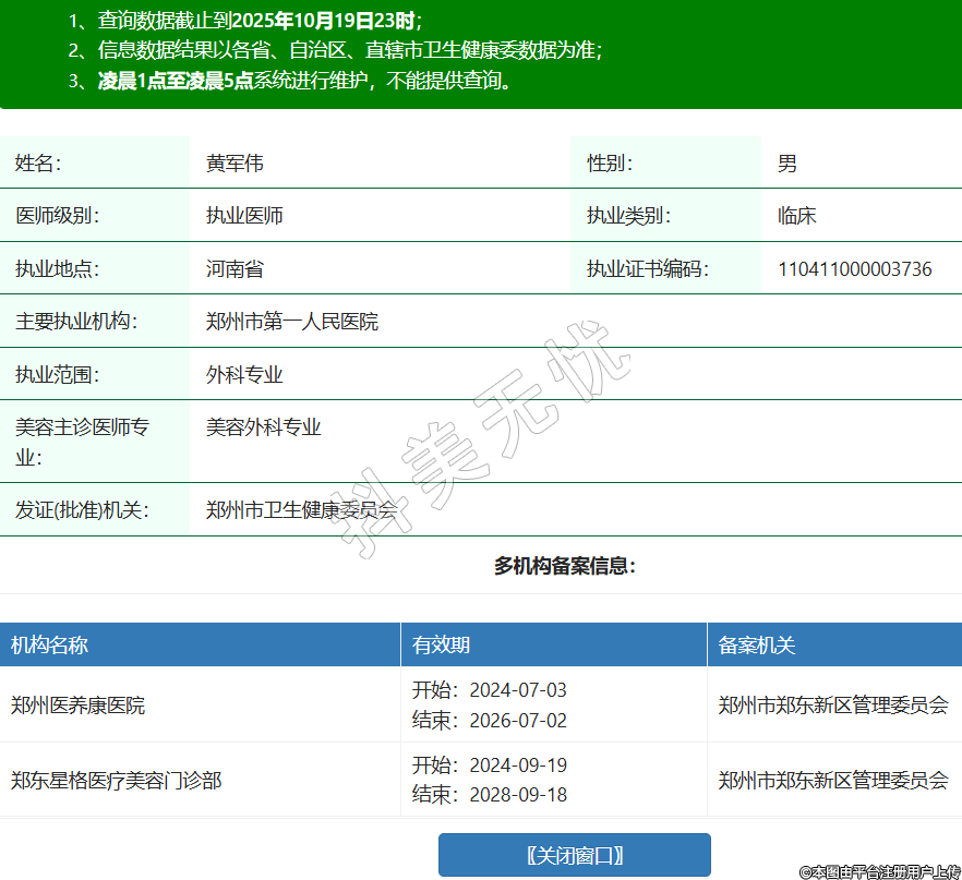 姓名:黃軍偉性別:男醫(yī)師級別:執(zhí)業(yè)醫(yī)師執(zhí)業(yè)類別:臨床執(zhí)業(yè)地點:河南省執(zhí)業(yè)證書編碼:110411000003736主要執(zhí)業(yè)機構(gòu):鄭州市第一人民醫(yī)院執(zhí)業(yè)范圍:外科專業(yè)美容主診醫(yī)師專業(yè):美容外科專業(yè)發(fā)證(批準(zhǔn))機關(guān):鄭州市衛(wèi)生健康委員會多機構(gòu)備案信息:機構(gòu)名稱 有效期 備案機關(guān) 鄭州醫(yī)養(yǎng)康醫(yī)院 開始:2024-07-03結(jié)束:2026-07-02鄭州市鄭東新區(qū)管理委員會 鄭東星格醫(yī)療美容門診部 開始:2024-09-19結(jié)束:2028-09-18鄭州市鄭東新區(qū)管理委員會 -