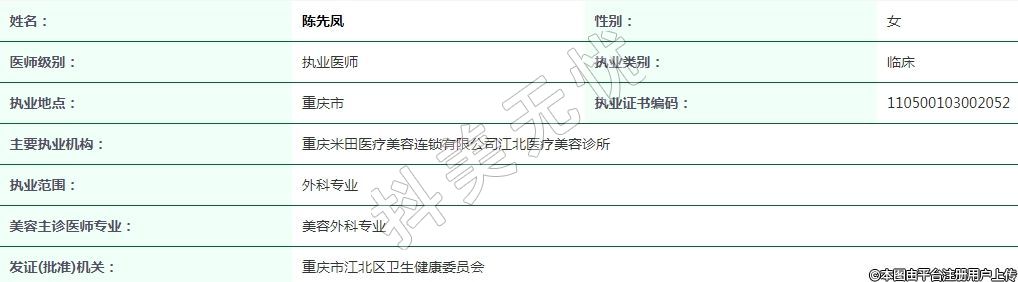 主要執(zhí)業(yè)機構(gòu):重慶米田醫(yī)療美容連鎖有限公司江北醫(yī)療美容診所