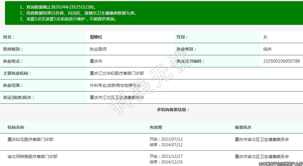 主要執(zhí)業(yè)機(jī)構(gòu):重慶江北華妃醫(yī)療美容門診部