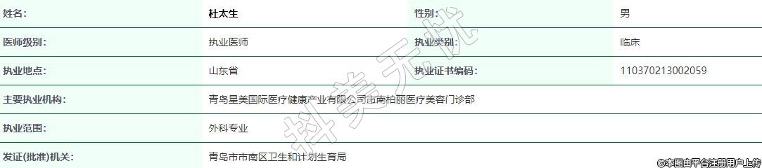 主要執(zhí)業(yè)機構:青島星美國際醫(yī)療健康產(chǎn)業(yè)有限公司市南柏麗醫(yī)療美容門診部