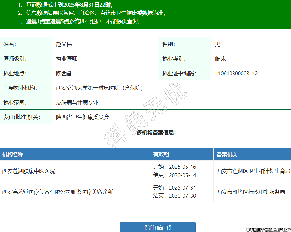 姓名:趙文偉性別:男醫(yī)師級別:執(zhí)業(yè)醫(yī)師執(zhí)業(yè)類別:臨床執(zhí)業(yè)地點(diǎn):陜西省執(zhí)業(yè)證書編碼:110610300003112主要執(zhí)業(yè)機(jī)構(gòu):西安交通大學(xué)第一附屬醫(yī)院(含東院)執(zhí)業(yè)范圍:皮膚病與性病專業(yè)發(fā)證(批準(zhǔn))機(jī)關(guān):陜西省衛(wèi)生健康委員會多機(jī)構(gòu)備案信息:機(jī)構(gòu)名稱 有效期 備案機(jī)關(guān) 西安蓮湖膚康中醫(yī)醫(yī)院 開始:2025-05-16結(jié)束:2030-05-14西安市蓮湖區(qū)衛(wèi)生和計(jì)劃生育局 西安嘉藝堂醫(yī)療美容有限公司雁塔醫(yī)療美容診所 開始:2025-07-31結(jié)束:2030-07-30西安市雁塔區(qū)行政審批服務(wù)局 -