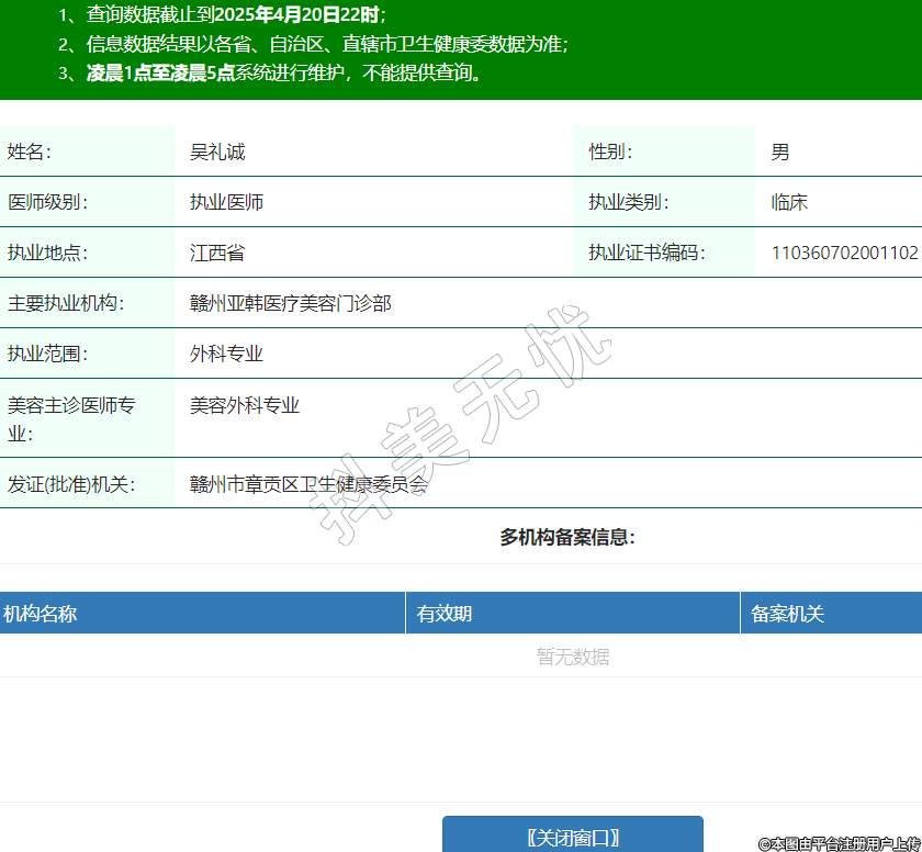 姓名:吳禮誠性別:男醫(yī)師級別:執(zhí)業(yè)醫(yī)師執(zhí)業(yè)類別:臨床執(zhí)業(yè)地點(diǎn):江西省執(zhí)業(yè)證書編碼:110360702001102主要執(zhí)業(yè)機(jī)構(gòu):贛州亞韓醫(yī)療美容門診部執(zhí)業(yè)范圍:外科專業(yè)美容主診醫(yī)師專業(yè):美容外科專業(yè)發(fā)證(批準(zhǔn))機(jī)關(guān):贛州市章貢區(qū)衛(wèi)生健康委員會 -