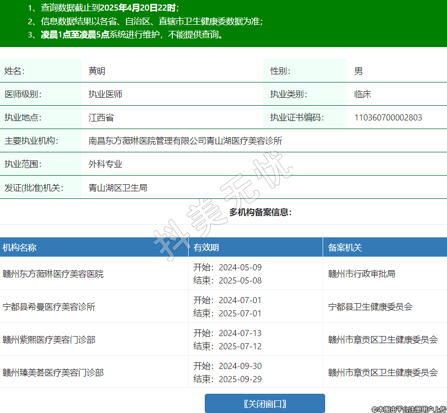 姓名:黃明性別:男醫(yī)師級(jí)別:執(zhí)業(yè)醫(yī)師執(zhí)業(yè)類(lèi)別:臨床執(zhí)業(yè)地點(diǎn):江西省執(zhí)業(yè)證書(shū)編碼:110360700002803主要執(zhí)業(yè)機(jī)構(gòu):南昌東方薇琳醫(yī)院管理有限公司青山湖醫(yī)療美容診所執(zhí)業(yè)范圍:外科專(zhuān)業(yè)發(fā)證(批準(zhǔn))機(jī)關(guān):青山湖區(qū)衛(wèi)生局多機(jī)構(gòu)備案信息:機(jī)構(gòu)名稱 有效期 備案機(jī)關(guān) 贛州東方薇琳醫(yī)療美容醫(yī)院 開(kāi)始:2024-05-09結(jié)束:2025-05-08贛州市行政審批局 寧都縣希曼醫(yī)療美容診所 開(kāi)始:2024-07-01結(jié)束:2025-07-01寧都縣衛(wèi)生健康委員會(huì) 贛州紫熙醫(yī)療美容門(mén)診部 開(kāi)始:2024-07-13結(jié)束:2025-07-12贛州市章貢區(qū)衛(wèi)生健康委員會(huì) 贛州臻美薈醫(yī)療美容門(mén)診部 開(kāi)始:2024-09-30結(jié)束:2025-09-29贛州市章貢區(qū)衛(wèi)生健康委員會(huì) -