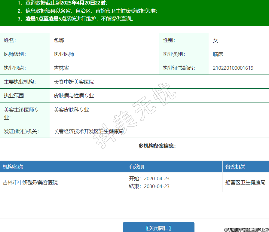姓名:包娜性別:女醫(yī)師級(jí)別:執(zhí)業(yè)醫(yī)師執(zhí)業(yè)類別:臨床執(zhí)業(yè)地點(diǎn):吉林省執(zhí)業(yè)證書編碼:210220100001619主要執(zhí)業(yè)機(jī)構(gòu):長春中妍美容醫(yī)院執(zhí)業(yè)范圍:皮膚病與性病專業(yè)美容主診醫(yī)師專業(yè):美容皮膚科專業(yè)發(fā)證(批準(zhǔn))機(jī)關(guān):長春經(jīng)濟(jì)技術(shù)開發(fā)區(qū)衛(wèi)生健康局多機(jī)構(gòu)備案信息:機(jī)構(gòu)名稱 有效期 備案機(jī)關(guān) 吉林市中妍整形美容醫(yī)院 開始:2020-04-23結(jié)束:2030-04-23船營區(qū)衛(wèi)生健康局 -