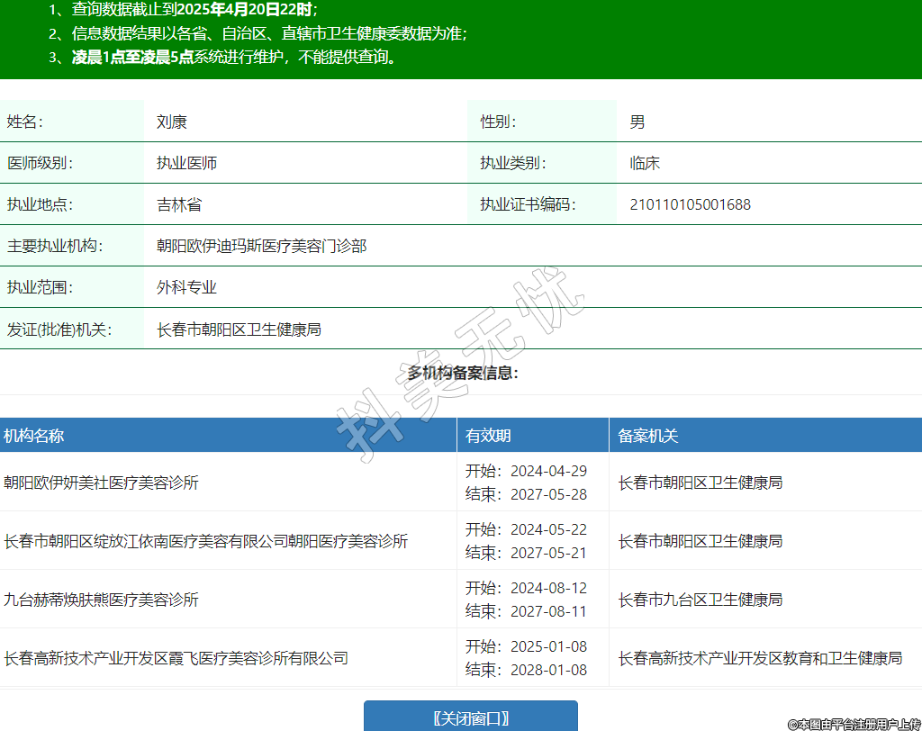 姓名:劉康性別:男醫(yī)師級別:執(zhí)業(yè)醫(yī)師執(zhí)業(yè)類別:臨床執(zhí)業(yè)地點:吉林省執(zhí)業(yè)證書編碼:210110105001688主要執(zhí)業(yè)機構:朝陽歐伊迪瑪斯醫(yī)療美容門診部執(zhí)業(yè)范圍:外科專業(yè)發(fā)證(批準)機關:長春市朝陽區(qū)衛(wèi)生健康局多機構備案信息:機構名稱 有效期 備案機關 朝陽歐伊妍美社醫(yī)療美容診所 開始:2024-04-29結束:2027-05-28長春市朝陽區(qū)衛(wèi)生健康局 長春市朝陽區(qū)綻放江依南醫(yī)療美容有限公司朝陽醫(yī)療美容診所 開始:2024-05-22結束:2027-05-21長春市朝陽區(qū)衛(wèi)生健康局 九臺赫蒂煥膚熊醫(yī)療美容診所 開始:2024-08-12結束:2027-08-11長春市九臺區(qū)衛(wèi)生健康局 長春高新技術產業(yè)開發(fā)區(qū)霞飛醫(yī)療美容診所有限公司 開始:2025-01-08結束:2028-01-08長春高新技術產業(yè)開發(fā)區(qū)教育和衛(wèi)生健康局 -