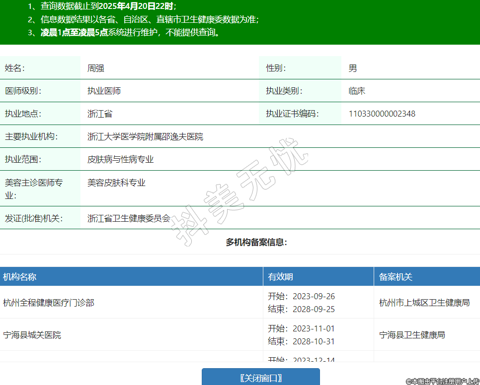 姓名:周強(qiáng)性別:男醫(yī)師級(jí)別:執(zhí)業(yè)醫(yī)師執(zhí)業(yè)類別:臨床執(zhí)業(yè)地點(diǎn):浙江省執(zhí)業(yè)證書編碼:110330000002348主要執(zhí)業(yè)機(jī)構(gòu):浙江大學(xué)醫(yī)學(xué)院附屬邵逸夫醫(yī)院執(zhí)業(yè)范圍:皮膚病與性病專業(yè)美容主診醫(yī)師專業(yè):美容皮膚科專業(yè)發(fā)證(批準(zhǔn))機(jī)關(guān):浙江省衛(wèi)生健康委員會(huì)多機(jī)構(gòu)備案信息:機(jī)構(gòu)名稱 有效期 備案機(jī)關(guān) 杭州全程健康醫(yī)療門診部 開始:2023-09-26結(jié)束:2028-09-25杭州市上城區(qū)衛(wèi)生健康局 寧??h城關(guān)醫(yī)院 開始:2023-11-01結(jié)束:2028-10-31寧??h衛(wèi)生健康局 坤益(杭州)健康管理有限公司武林綜合門診部 開始:2023-12-14結(jié)束:2028-12-13杭州市拱墅區(qū)衛(wèi)生健康局 -