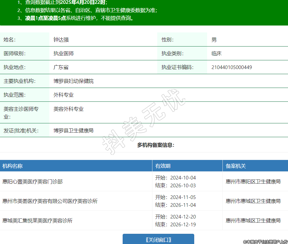 姓名:鐘達(dá)強(qiáng)性別:男醫(yī)師級別:執(zhí)業(yè)醫(yī)師執(zhí)業(yè)類別:臨床執(zhí)業(yè)地點:廣東省執(zhí)業(yè)證書編碼:210440105000449主要執(zhí)業(yè)機(jī)構(gòu):博羅縣婦幼保健院執(zhí)業(yè)范圍:外科專業(yè)美容主診醫(yī)師專業(yè):美容外科專業(yè)發(fā)證(批準(zhǔn))機(jī)關(guān):博羅縣衛(wèi)生健康局多機(jī)構(gòu)備案信息:機(jī)構(gòu)名稱 有效期 備案機(jī)關(guān) 惠陽心壹美醫(yī)療美容門診部 開始:2024-10-04結(jié)束:2026-10-03惠州市惠陽區(qū)衛(wèi)生健康局 惠州市美薈醫(yī)療美容有限公司醫(yī)療美容診所 開始:2024-11-05結(jié)束:2026-11-04惠州市惠城區(qū)衛(wèi)生健康局 惠城美匯集悅?cè)R美醫(yī)療美容診所 開始:2024-12-20結(jié)束:2026-12-19惠州市惠城區(qū)衛(wèi)生健康局 -