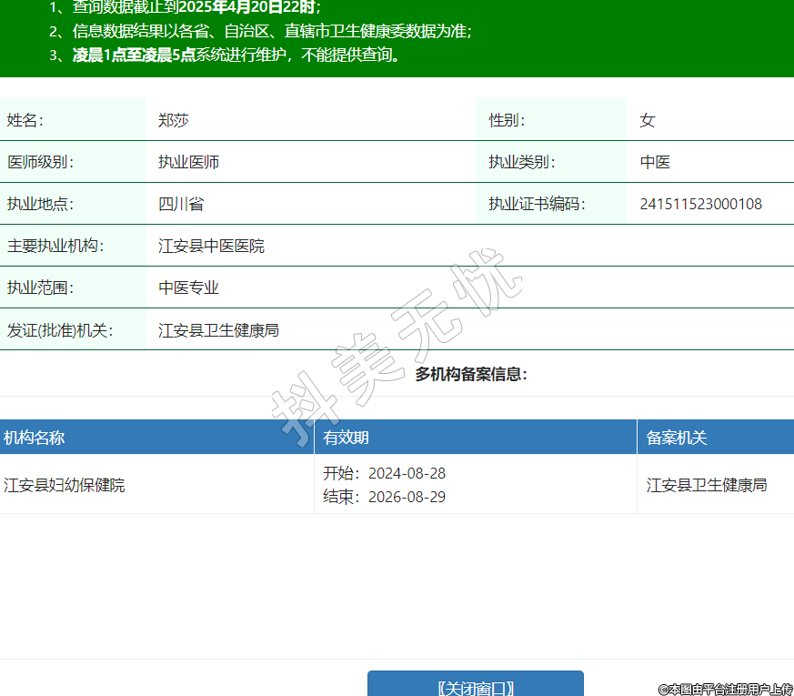 姓名:鄭莎性別:女醫(yī)師級別:執(zhí)業(yè)醫(yī)師執(zhí)業(yè)類別:中醫(yī)執(zhí)業(yè)地點:四川省執(zhí)業(yè)證書編碼:241511523000108主要執(zhí)業(yè)機構(gòu):江安縣中醫(yī)醫(yī)院執(zhí)業(yè)范圍:中醫(yī)專業(yè)發(fā)證(批準)機關(guān):江安縣衛(wèi)生健康局多機構(gòu)備案信息:機構(gòu)名稱 有效期 備案機關(guān) 江安縣婦幼保健院 開始:2024-08-28結(jié)束:2026-08-29江安縣衛(wèi)生健康局 -