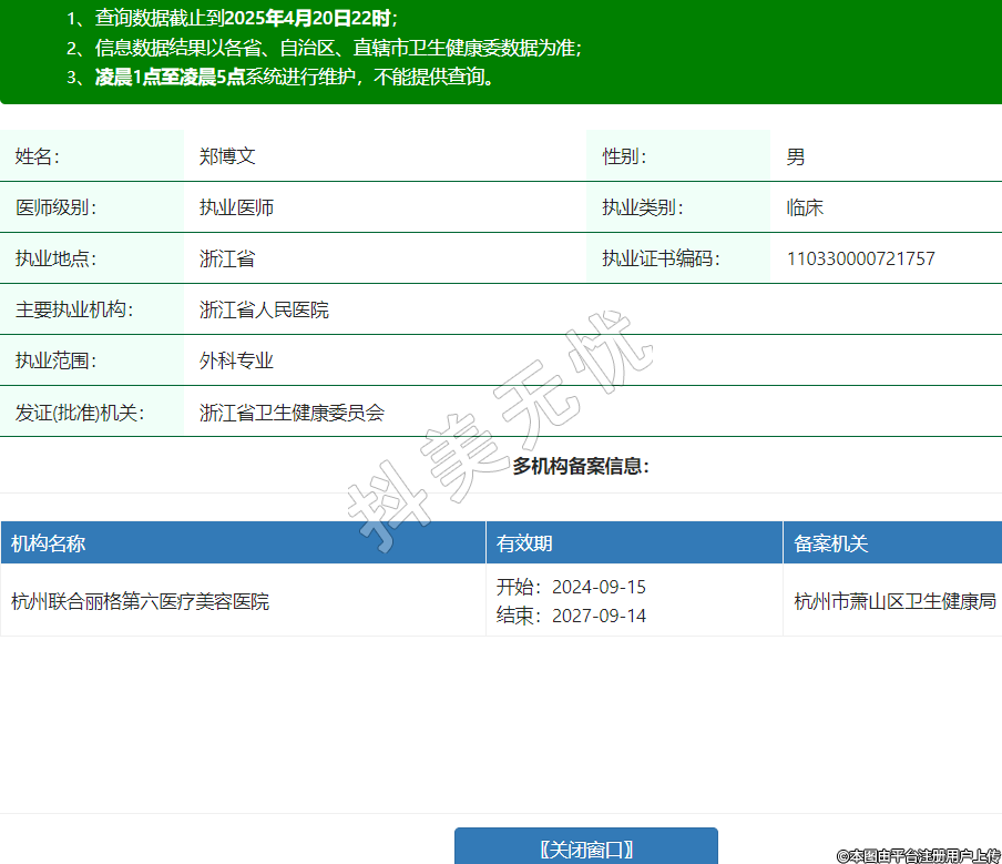 姓名:鄭博文性別:男醫(yī)師級(jí)別:執(zhí)業(yè)醫(yī)師執(zhí)業(yè)類別:臨床執(zhí)業(yè)地點(diǎn):浙江省執(zhí)業(yè)證書(shū)編碼:110330000721757主要執(zhí)業(yè)機(jī)構(gòu):浙江省人民醫(yī)院執(zhí)業(yè)范圍:外科專業(yè)發(fā)證(批準(zhǔn))機(jī)關(guān):浙江省衛(wèi)生健康委員會(huì)多機(jī)構(gòu)備案信息:機(jī)構(gòu)名稱 有效期 備案機(jī)關(guān) 杭州聯(lián)合麗格第六醫(yī)療美容醫(yī)院 開(kāi)始:2024-09-15結(jié)束:2027-09-14杭州市蕭山區(qū)衛(wèi)生健康局 -