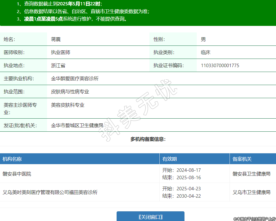 姓名:蔣震性別:男醫(yī)師級(jí)別:執(zhí)業(yè)醫(yī)師執(zhí)業(yè)類別:臨床執(zhí)業(yè)地點(diǎn):浙江省執(zhí)業(yè)證書編碼:110330700001775主要執(zhí)業(yè)機(jī)構(gòu):金華醉愛醫(yī)療美容診所執(zhí)業(yè)范圍:皮膚病與性病專業(yè)美容主診醫(yī)師專業(yè):美容皮膚科專業(yè)發(fā)證(批準(zhǔn))機(jī)關(guān):金華市婺城區(qū)衛(wèi)生健康局多機(jī)構(gòu)備案信息:機(jī)構(gòu)名稱 有效期 備案機(jī)關(guān) 磐安縣中醫(yī)院 開始:2024-08-17結(jié)束:2025-08-16磐安縣衛(wèi)生健康局 義烏美時(shí)美刻醫(yī)療管理有限公司福田美容診所 開始:2025-04-23結(jié)束:2030-04-22義烏市衛(wèi)生健康局 -
