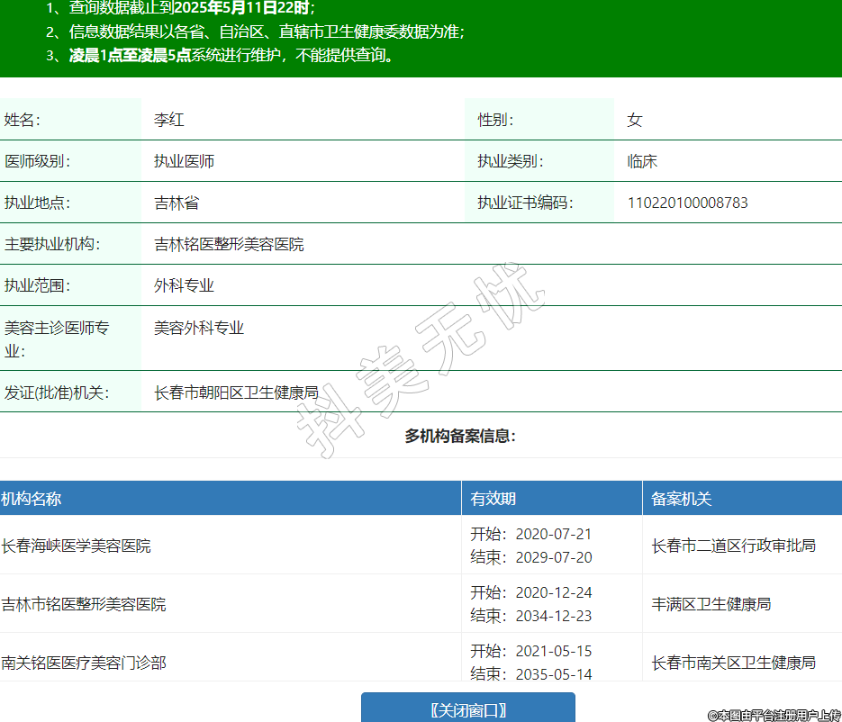 姓名:李紅性別:女醫(yī)師級別:執(zhí)業(yè)醫(yī)師執(zhí)業(yè)類別:臨床執(zhí)業(yè)地點(diǎn):吉林省執(zhí)業(yè)證書編碼:110220100008783主要執(zhí)業(yè)機(jī)構(gòu):吉林銘醫(yī)整形美容醫(yī)院執(zhí)業(yè)范圍:外科專業(yè)美容主診醫(yī)師專業(yè):美容外科專業(yè)發(fā)證(批準(zhǔn))機(jī)關(guān):長春市朝陽區(qū)衛(wèi)生健康局多機(jī)構(gòu)備案信息:機(jī)構(gòu)名稱 有效期 備案機(jī)關(guān) 長春海峽醫(yī)學(xué)美容醫(yī)院 開始:2020-07-21結(jié)束:2029-07-20長春市二道區(qū)行政審批局 吉林市銘醫(yī)整形美容醫(yī)院 開始:2020-12-24結(jié)束:2034-12-23豐滿區(qū)衛(wèi)生健康局 南關(guān)銘醫(yī)醫(yī)療美容門診部 開始:2021-05-15結(jié)束:2035-05-14長春市南關(guān)區(qū)衛(wèi)生健康局 朝陽美佳銘醫(yī)醫(yī)療美容門診部 開始:2021-06-08結(jié)束:2035-06-08長春市朝陽區(qū)衛(wèi)生健康局 吉林國金醫(yī)院 開始:2022-07-27結(jié)束:2035-08-18長春市衛(wèi)生健康委員會 長春市銘醫(yī)醫(yī)療美容有限公司經(jīng)開銘醫(yī)醫(yī)療美容診所 開始:2024-10-12結(jié)束:2027-10-31長春經(jīng)濟(jì)技術(shù)開發(fā)區(qū)社會發(fā)展局 -