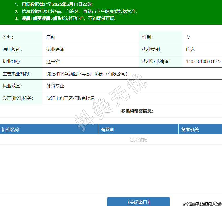 姓名:白莉性別:女醫(yī)師級別:執(zhí)業(yè)醫(yī)師執(zhí)業(yè)類別:臨床執(zhí)業(yè)地點:遼寧省執(zhí)業(yè)證書編碼:110210100001973主要執(zhí)業(yè)機構(gòu):沈陽和平童顏醫(yī)療美容門診部(有限公司)執(zhí)業(yè)范圍:外科專業(yè)發(fā)證(批準)機關(guān):沈陽市和平區(qū)行政審批局 -