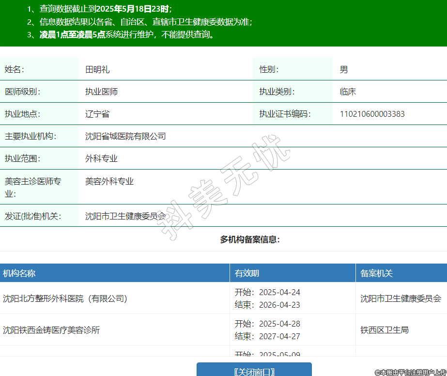 姓名:田明禮性別:男醫(yī)師級(jí)別:執(zhí)業(yè)醫(yī)師執(zhí)業(yè)類別:臨床執(zhí)業(yè)地點(diǎn):遼寧省執(zhí)業(yè)證書編碼:110210600003383主要執(zhí)業(yè)機(jī)構(gòu):沈陽(yáng)省城醫(yī)院有限公司執(zhí)業(yè)范圍:外科專業(yè)美容主診醫(yī)師專業(yè):美容外科專業(yè)發(fā)證(批準(zhǔn))機(jī)關(guān):沈陽(yáng)市衛(wèi)生健康委員會(huì)多機(jī)構(gòu)備案信息:機(jī)構(gòu)名稱 有效期 備案機(jī)關(guān) 沈陽(yáng)北方整形外科醫(yī)院(有限公司) 開始:2025-04-24結(jié)束:2026-04-23沈陽(yáng)市衛(wèi)生健康委員會(huì) 沈陽(yáng)鐵西金鑄醫(yī)療美容診所 開始:2025-04-28結(jié)束:2027-04-27鐵西區(qū)衛(wèi)生局 沈陽(yáng)保髖骨科醫(yī)院(有限公司) 開始:2025-05-09結(jié)束:2028-05-08沈陽(yáng)市衛(wèi)生健康委員會(huì) 沈陽(yáng)維康醫(yī)院 開始:2025-05-09結(jié)束:2028-05-08沈陽(yáng)市衛(wèi)生健康委員會(huì) -