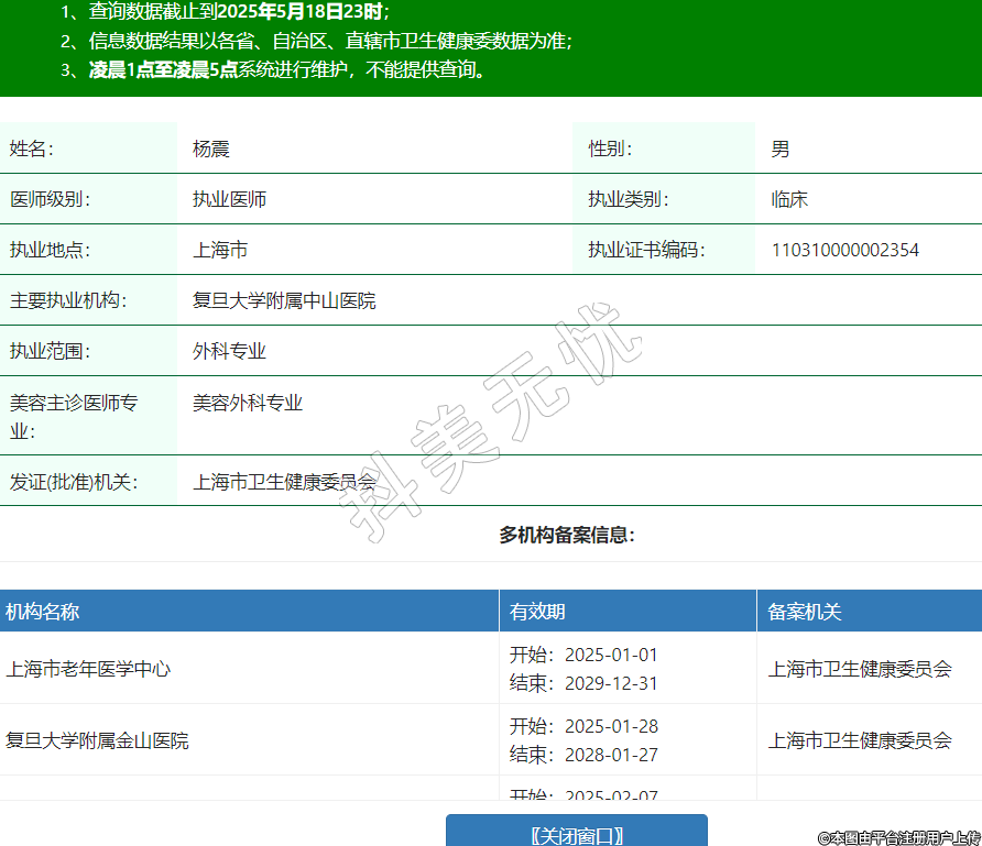 姓名:楊震性別:男醫(yī)師級別:執(zhí)業(yè)醫(yī)師執(zhí)業(yè)類別:臨床執(zhí)業(yè)地點:上海市執(zhí)業(yè)證書編碼:110310000002354主要執(zhí)業(yè)機構(gòu):復旦大學附屬中山醫(yī)院執(zhí)業(yè)范圍:外科專業(yè)美容主診醫(yī)師專業(yè):美容外科專業(yè)發(fā)證(批準)機關:上海市衛(wèi)生健康委員會多機構(gòu)備案信息:機構(gòu)名稱 有效期 備案機關 上海市老年醫(yī)學中心 開始:2025-01-01結(jié)束:2029-12-31上海市衛(wèi)生健康委員會 復旦大學附屬金山醫(yī)院 開始:2025-01-28結(jié)束:2028-01-27上海市衛(wèi)生健康委員會 上海市金山區(qū)山陽鎮(zhèn)社區(qū)衛(wèi)生服務中心 開始:2025-02-07結(jié)束:2028-02-06上海市金山區(qū)衛(wèi)生健康委員會 -
