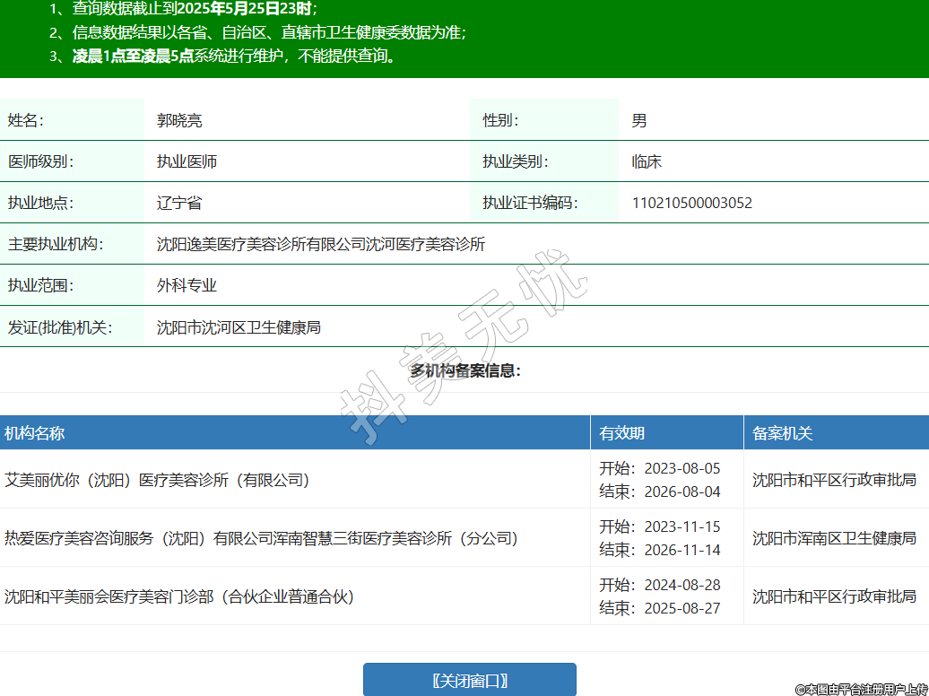姓名:郭曉亮性別:男醫(yī)師級別:執(zhí)業(yè)醫(yī)師執(zhí)業(yè)類別:臨床執(zhí)業(yè)地點:遼寧省執(zhí)業(yè)證書編碼:110210500003052主要執(zhí)業(yè)機構(gòu):沈陽逸美醫(yī)療美容診所有限公司沈河醫(yī)療美容診所執(zhí)業(yè)范圍:外科專業(yè)發(fā)證(批準)機關(guān):沈陽市沈河區(qū)衛(wèi)生健康局多機構(gòu)備案信息:機構(gòu)名稱 有效期 備案機關(guān) 艾美麗優(yōu)你(沈陽)醫(yī)療美容診所(有限公司) 開始:2023-08-05結(jié)束:2026-08-04沈陽市和平區(qū)行政審批局 熱愛醫(yī)療美容咨詢服務(wù)(沈陽)有限公司渾南智慧三街醫(yī)療美容診所(分公司) 開始:2023-11-15結(jié)束:2026-11-14沈陽市渾南區(qū)衛(wèi)生健康局 沈陽和平美麗會醫(yī)療美容門診部(合伙企業(yè)普通合伙) 開始:2024-08-28結(jié)束:2025-08-27沈陽市和平區(qū)行政審批局 -