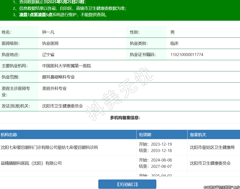 姓名:鐘一凡性別:男醫(yī)師級別:執(zhí)業(yè)醫(yī)師執(zhí)業(yè)類別:臨床執(zhí)業(yè)地點:遼寧省執(zhí)業(yè)證書編碼:110210000011774主要執(zhí)業(yè)機構(gòu):中國醫(yī)科大學附屬第一醫(yī)院執(zhí)業(yè)范圍:眼耳鼻咽喉科專業(yè)美容主診醫(yī)師專業(yè):美容外科專業(yè)發(fā)證(批準)機關(guān):沈陽市衛(wèi)生健康委員會多機構(gòu)備案信息:機構(gòu)名稱 有效期 備案機關(guān) 沈陽七彩愛目眼科門診有限公司皇姑七彩愛目眼科診所 開始:2023-12-19結(jié)束:2033-12-18沈陽市皇姑區(qū)衛(wèi)生健康局 益精睛眼科醫(yī)院(沈陽)有限公司 開始:2024-08-08結(jié)束:2027-08-07沈陽市衛(wèi)生健康委員會 沈陽省城醫(yī)院有限公司 開始:2025-04-02結(jié)束:2026-04-30沈陽市衛(wèi)生健康委員會 沈陽億美澤醫(yī)療管理有限公司和平億美醫(yī)療美容門診部 開始:2025-04-07結(jié)束:2026-04-30沈陽市和平區(qū)行政審批局 -