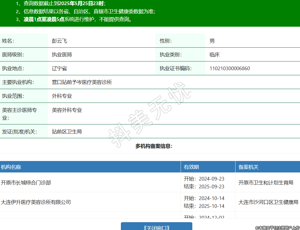 姓名:彭云飛性別:男醫(yī)師級別:執(zhí)業(yè)醫(yī)師執(zhí)業(yè)類別:臨床執(zhí)業(yè)地點:遼寧省執(zhí)業(yè)證書編碼:110210300006860主要執(zhí)業(yè)機構:營口站前予岑醫(yī)療美容診所執(zhí)業(yè)范圍:外科專業(yè)美容主診醫(yī)師專業(yè):美容外科專業(yè)發(fā)證(批準)機關:站前區(qū)衛(wèi)生局多機構備案信息:機構名稱 有效期 備案機關 開原市長城綜合門診部 開始:2024-09-23結束:2025-09-23開原市衛(wèi)生和計劃生育局 大連伊升醫(yī)療美容診所有限公司 開始:2024-10-14結束:2025-10-14大連市沙河口區(qū)衛(wèi)生健康局 大連銳斯醫(yī)療美容診所有限公司 開始:2024-12-02結束:2025-12-01大連市沙河口區(qū)衛(wèi)生健康局 大連初禾醫(yī)美綜合門診部有限公司 開始:2025-03-24結束:2028-03-31莊河市衛(wèi)生健康局 沈陽澳紫汣美醫(yī)療管理有限公司渾南臨波路醫(yī)療美容診所(分公司) 開始:2025-04-21結束:2028-04-29沈陽市渾南區(qū)衛(wèi)生健康局 -