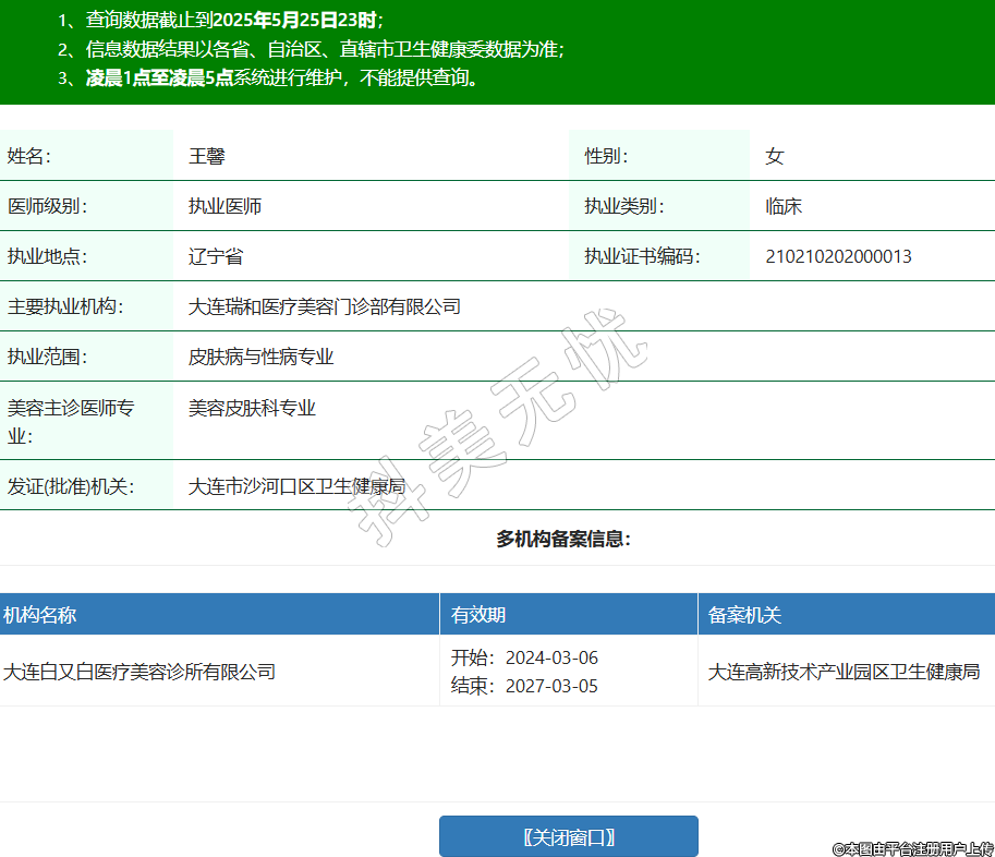 姓名:王馨性別:女醫(yī)師級別:執(zhí)業(yè)醫(yī)師執(zhí)業(yè)類別:臨床執(zhí)業(yè)地點:遼寧省執(zhí)業(yè)證書編碼:210210202000013主要執(zhí)業(yè)機(jī)構(gòu):大連瑞和醫(yī)療美容門診部有限公司執(zhí)業(yè)范圍:皮膚病與性病專業(yè)美容主診醫(yī)師專業(yè):美容皮膚科專業(yè)發(fā)證(批準(zhǔn))機(jī)關(guān):大連市沙河口區(qū)衛(wèi)生健康局多機(jī)構(gòu)備案信息:機(jī)構(gòu)名稱 有效期 備案機(jī)關(guān) 大連白又白醫(yī)療美容診所有限公司 開始:2024-03-06結(jié)束:2027-03-05大連高新技術(shù)產(chǎn)業(yè)園區(qū)衛(wèi)生健康局 -