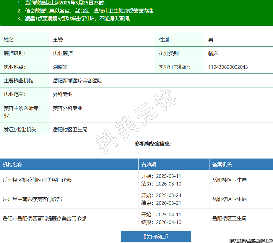 姓名:王贊性別:男醫(yī)師級(jí)別:執(zhí)業(yè)醫(yī)師執(zhí)業(yè)類別:臨床執(zhí)業(yè)地點(diǎn):湖南省執(zhí)業(yè)證書編碼:110430600002043主要執(zhí)業(yè)機(jī)構(gòu):岳陽新顏醫(yī)療美容醫(yī)院執(zhí)業(yè)范圍:外科專業(yè)美容主診醫(yī)師專業(yè):美容外科專業(yè)發(fā)證(批準(zhǔn))機(jī)關(guān):岳陽樓區(qū)衛(wèi)生局多機(jī)構(gòu)備案信息:機(jī)構(gòu)名稱 有效期 備案機(jī)關(guān) 岳陽樓區(qū)桃花仙醫(yī)療美容門診部 開始:2025-03-11結(jié)束:2026-03-10岳陽樓區(qū)衛(wèi)生局 岳陽星中南醫(yī)療美容門診部 開始:2025-03-24結(jié)束:2026-03-21岳陽樓區(qū)衛(wèi)生局 岳陽市岳陽樓區(qū)普瑞緹醫(yī)療美容門診部 開始:2025-04-11結(jié)束:2026-04-10岳陽樓區(qū)衛(wèi)生局 岳陽市南湖新區(qū)榆梵皙醫(yī)療美容門診部 開始:2025-04-18結(jié)束:2026-04-17岳陽市南湖新區(qū)衛(wèi)生健康局 -