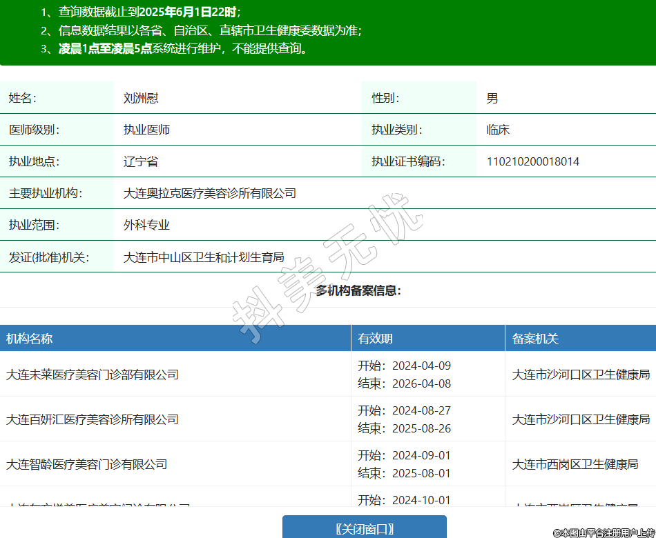 姓名:劉洲慰性別:男醫(yī)師級(jí)別:執(zhí)業(yè)醫(yī)師執(zhí)業(yè)類別:臨床執(zhí)業(yè)地點(diǎn):遼寧省執(zhí)業(yè)證書(shū)編碼:110210200018014主要執(zhí)業(yè)機(jī)構(gòu):大連奧拉克醫(yī)療美容診所有限公司執(zhí)業(yè)范圍:外科專業(yè)發(fā)證(批準(zhǔn))機(jī)關(guān):大連市中山區(qū)衛(wèi)生和計(jì)劃生育局多機(jī)構(gòu)備案信息:機(jī)構(gòu)名稱 有效期 備案機(jī)關(guān) 大連未萊醫(yī)療美容門診部有限公司 開(kāi)始:2024-04-09結(jié)束:2026-04-08大連市沙河口區(qū)衛(wèi)生健康局 大連百妍匯醫(yī)療美容診所有限公司 開(kāi)始:2024-08-27結(jié)束:2025-08-26大連市沙河口區(qū)衛(wèi)生健康局 大連智齡醫(yī)療美容門診有限公司 開(kāi)始:2024-09-01結(jié)束:2025-08-01大連市西崗區(qū)衛(wèi)生健康局 大連東方悅美醫(yī)療美容門診有限公司 開(kāi)始:2024-10-01結(jié)束:2025-09-01大連市西崗區(qū)衛(wèi)生健康局 大連華美希華醫(yī)療美容門診部有限公司 開(kāi)始:2024-12-26結(jié)束:2025-12-25大連市沙河口區(qū)衛(wèi)生健康局 大連金普新區(qū)星萊美匯醫(yī)療美容診所有限公司 開(kāi)始:2025-04-28結(jié)束:2026-04-27大連金普新區(qū)衛(wèi)生健康局 -