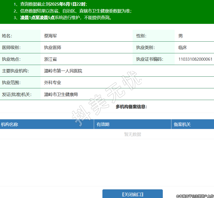 姓名:蔡海軍性別:男醫(yī)師級別:執(zhí)業(yè)醫(yī)師執(zhí)業(yè)類別:臨床執(zhí)業(yè)地點:浙江省執(zhí)業(yè)證書編碼:110331082000061主要執(zhí)業(yè)機構:溫嶺市第一人民醫(yī)院執(zhí)業(yè)范圍:外科專業(yè)發(fā)證(批準)機關:溫嶺市衛(wèi)生健康局 -