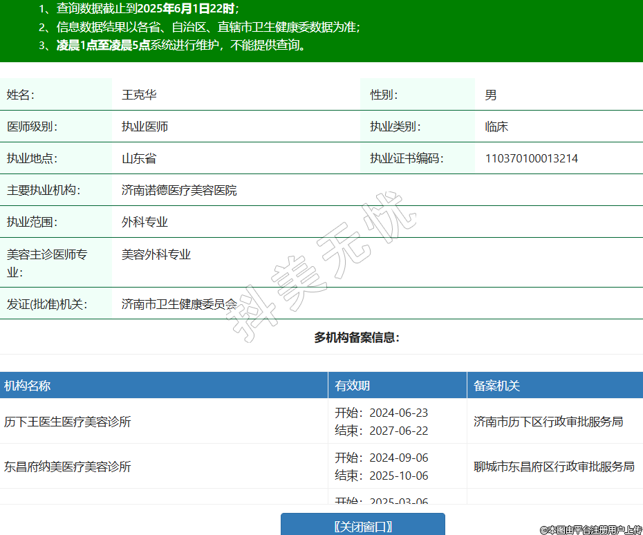 姓名:王克華性別:男醫(yī)師級別:執(zhí)業(yè)醫(yī)師執(zhí)業(yè)類別:臨床執(zhí)業(yè)地點:山東省執(zhí)業(yè)證書編碼:110370100013214主要執(zhí)業(yè)機(jī)構(gòu):濟(jì)南諾德醫(yī)療美容醫(yī)院執(zhí)業(yè)范圍:外科專業(yè)美容主診醫(yī)師專業(yè):美容外科專業(yè)發(fā)證(批準(zhǔn))機(jī)關(guān):濟(jì)南市衛(wèi)生健康委員會多機(jī)構(gòu)備案信息:機(jī)構(gòu)名稱 有效期 備案機(jī)關(guān) 歷下王醫(yī)生醫(yī)療美容診所 開始:2024-06-23結(jié)束:2027-06-22濟(jì)南市歷下區(qū)行政審批服務(wù)局 東昌府納美醫(yī)療美容診所 開始:2024-09-06結(jié)束:2025-10-06聊城市東昌府區(qū)行政審批服務(wù)局 巨野縣北城醫(yī)院 開始:2025-03-06結(jié)束:2035-03-06巨野縣衛(wèi)生局 濟(jì)南卿之顏醫(yī)療服務(wù)有限公司歷城醫(yī)療美容診所 開始:2025-04-12結(jié)束:2026-04-12濟(jì)南市歷城區(qū)行政審批服務(wù)局 高新東瑞嘉合整形外科門診部 開始:2025-04-17結(jié)束:2026-04-17濟(jì)南高新技術(shù)產(chǎn)業(yè)開發(fā)區(qū)管理委員會 -