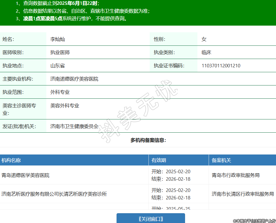 姓名:李燦燦性別:女醫(yī)師級別:執(zhí)業(yè)醫(yī)師執(zhí)業(yè)類別:臨床執(zhí)業(yè)地點:山東省執(zhí)業(yè)證書編碼:110370112001210主要執(zhí)業(yè)機構:濟南諾德醫(yī)療美容醫(yī)院執(zhí)業(yè)范圍:外科專業(yè)美容主診醫(yī)師專業(yè):美容外科專業(yè)發(fā)證(批準)機關:濟南市衛(wèi)生健康委員會多機構備案信息:機構名稱 有效期 備案機關 青島諾德醫(yī)學美容醫(yī)院 開始:2025-02-20結束:2026-02-18青島市行政審批服務局 濟南藝昕醫(yī)療服務有限公司長清藝昕醫(yī)療美容診所 開始:2025-02-20結束:2026-02-18濟南市長清區(qū)行政審批服務局 濟南云汀醫(yī)療美容有限公司槐蔭云汀醫(yī)療美容診所 開始:2025-05-25結束:2025-09-23濟南市槐蔭區(qū)行政審批服務局 -