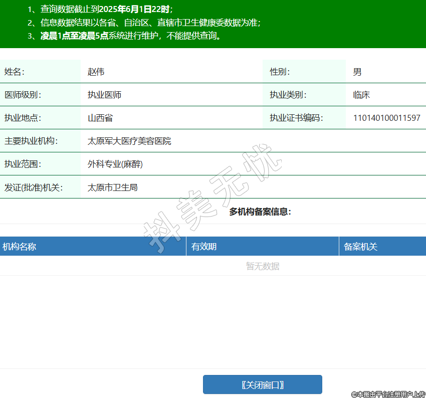 姓名:趙偉性別:男醫(yī)師級(jí)別:執(zhí)業(yè)醫(yī)師執(zhí)業(yè)類別:臨床執(zhí)業(yè)地點(diǎn):山西省執(zhí)業(yè)證書編碼:110140100011597主要執(zhí)業(yè)機(jī)構(gòu):太原軍大醫(yī)療美容醫(yī)院執(zhí)業(yè)范圍:外科專業(yè)(麻醉)發(fā)證(批準(zhǔn))機(jī)關(guān):太原市衛(wèi)生局 -