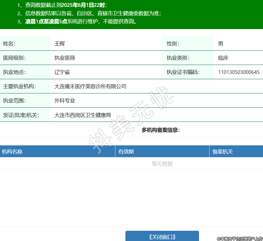 姓名:王輝性別:男醫(yī)師級別:執(zhí)業(yè)醫(yī)師執(zhí)業(yè)類別:臨床執(zhí)業(yè)地點:遼寧省執(zhí)業(yè)證書編碼:110130503000645主要執(zhí)業(yè)機構:大連雍禾醫(yī)療美容診所有限公司執(zhí)業(yè)范圍:外科專業(yè)發(fā)證(批準)機關:大連市西崗區(qū)衛(wèi)生健康局 -