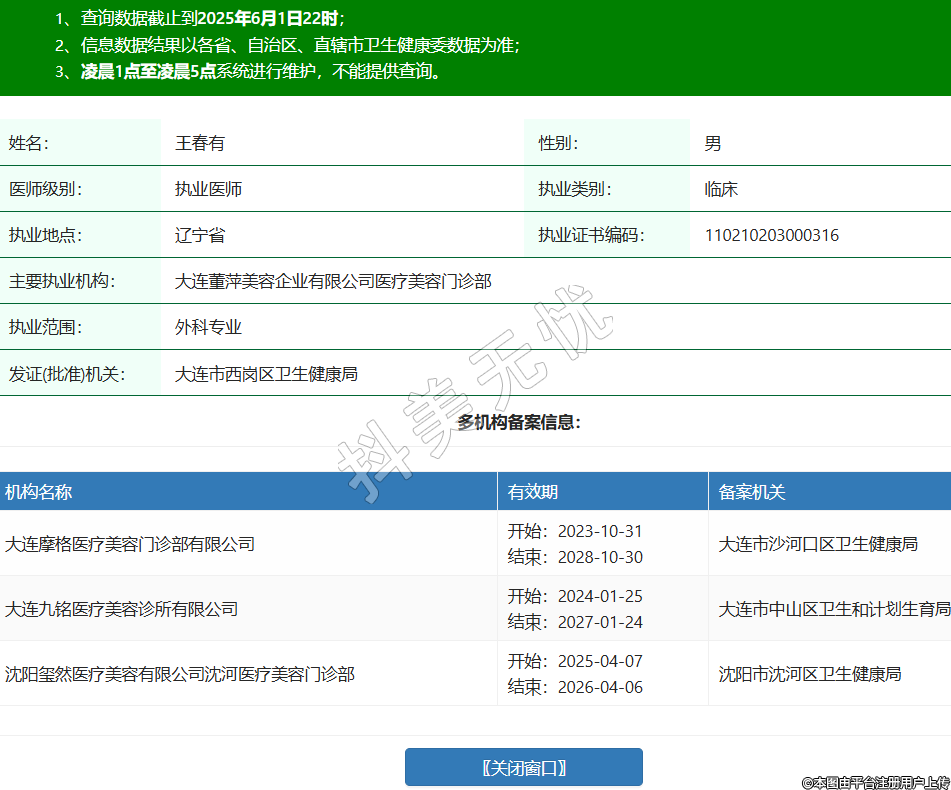 姓名:王春有性別:男醫(yī)師級(jí)別:執(zhí)業(yè)醫(yī)師執(zhí)業(yè)類別:臨床執(zhí)業(yè)地點(diǎn):遼寧省執(zhí)業(yè)證書編碼:110210203000316主要執(zhí)業(yè)機(jī)構(gòu):大連董萍美容企業(yè)有限公司醫(yī)療美容門診部執(zhí)業(yè)范圍:外科專業(yè)發(fā)證(批準(zhǔn))機(jī)關(guān):大連市西崗區(qū)衛(wèi)生健康局多機(jī)構(gòu)備案信息:機(jī)構(gòu)名稱 有效期 備案機(jī)關(guān) 大連摩格醫(yī)療美容門診部有限公司 開(kāi)始:2023-10-31結(jié)束:2028-10-30大連市沙河口區(qū)衛(wèi)生健康局 大連九銘醫(yī)療美容診所有限公司 開(kāi)始:2024-01-25結(jié)束:2027-01-24大連市中山區(qū)衛(wèi)生和計(jì)劃生育局 沈陽(yáng)璽然醫(yī)療美容有限公司沈河醫(yī)療美容門診部 開(kāi)始:2025-04-07結(jié)束:2026-04-06沈陽(yáng)市沈河區(qū)衛(wèi)生健康局 -
