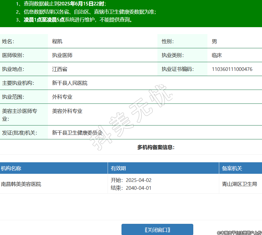 姓名:程凱性別:男醫(yī)師級別:執(zhí)業(yè)醫(yī)師執(zhí)業(yè)類別:臨床執(zhí)業(yè)地點:江西省執(zhí)業(yè)證書編碼:110360111000476主要執(zhí)業(yè)機構(gòu):新干縣人民醫(yī)院執(zhí)業(yè)范圍:外科專業(yè)美容主診醫(yī)師專業(yè):美容外科專業(yè)發(fā)證(批準(zhǔn))機關(guān):新干縣衛(wèi)生健康委員會多機構(gòu)備案信息:機構(gòu)名稱 有效期 備案機關(guān) 南昌韓美美容醫(yī)院 開始:2025-04-02結(jié)束:2040-04-01青山湖區(qū)衛(wèi)生局 -