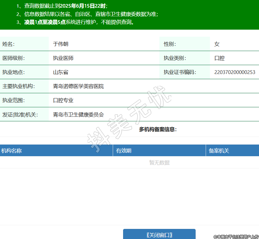 姓名:于偉朝性別:女醫(yī)師級(jí)別:執(zhí)業(yè)醫(yī)師執(zhí)業(yè)類(lèi)別:口腔執(zhí)業(yè)地點(diǎn):山東省執(zhí)業(yè)證書(shū)編碼:220370200000253主要執(zhí)業(yè)機(jī)構(gòu):青島諾德醫(yī)學(xué)美容醫(yī)院執(zhí)業(yè)范圍:口腔專(zhuān)業(yè)發(fā)證(批準(zhǔn))機(jī)關(guān):青島市衛(wèi)生健康委員會(huì) -