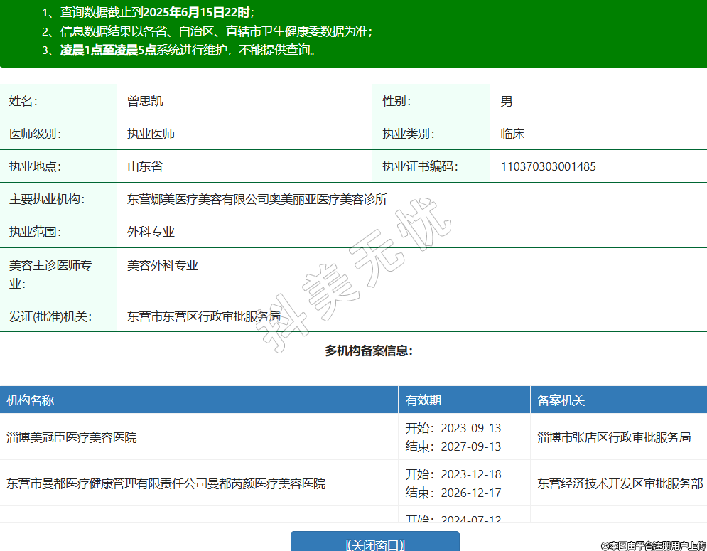 姓名:曾思凱性別:男醫(yī)師級別:執(zhí)業(yè)醫(yī)師執(zhí)業(yè)類別:臨床執(zhí)業(yè)地點:山東省執(zhí)業(yè)證書編碼:110370303001485主要執(zhí)業(yè)機構:東營娜美醫(yī)療美容有限公司奧美麗亞醫(yī)療美容診所執(zhí)業(yè)范圍:外科專業(yè)美容主診醫(yī)師專業(yè):美容外科專業(yè)發(fā)證(批準)機關:東營市東營區(qū)行政審批服務局多機構備案信息:機構名稱 有效期 備案機關 淄博美冠臣醫(yī)療美容醫(yī)院 開始:2023-09-13結束:2027-09-13淄博市張店區(qū)行政審批服務局 東營市曼都醫(yī)療健康管理有限責任公司曼都芮顏醫(yī)療美容醫(yī)院 開始:2023-12-18結束:2026-12-17東營經(jīng)濟技術開發(fā)區(qū)審批服務部 青島博士醫(yī)療美容醫(yī)院 開始:2024-07-12結束:2026-07-12青島市行政審批服務局 青島博士醫(yī)療美容醫(yī)院有限公司市南蜜柚醫(yī)療美容診所 開始:2024-09-05結束:2027-09-04青島市市南區(qū)行政審批服務局 -